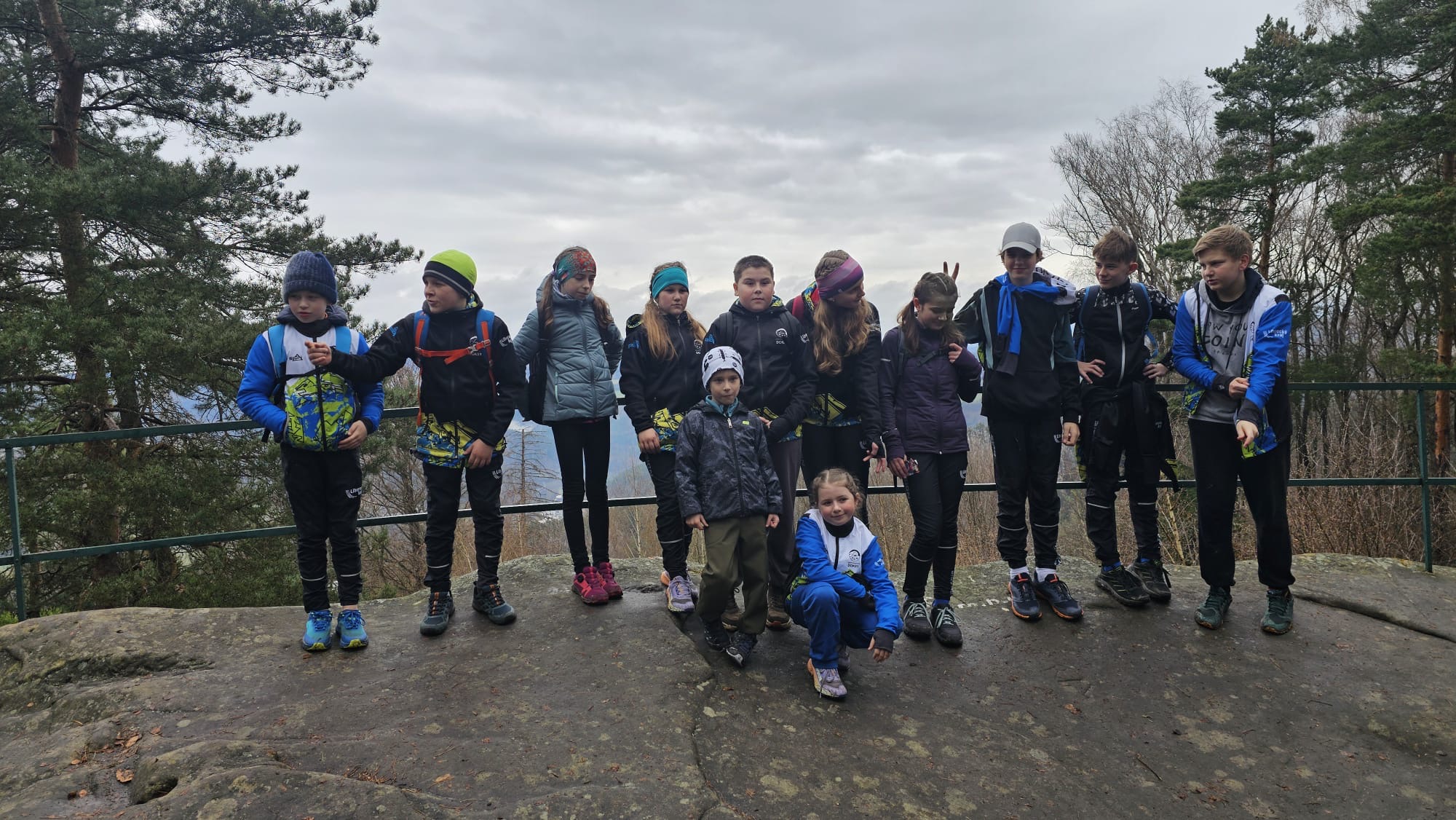 Na mapách, které poskytl turnovský oddíl, připravil Tonda 5 tréninků. Čtvrteční večer jsme nechali volný, přeci jen většina dospělých byla ještě v práci. Ale pátečním dopolednem to začalo. Nejprve jsme zjistili, že nám chybí téměř to nejdůležitější, lampiony na kontroly. Takže musela nastat změna plánů, Petra vyrazila zpátky do Vrchovan pro lampiony, a my jsme vyrazili na blízký svah trénovat směry (10 malých lampionů jsme měli k dispozici a to stačilo). Kdo zná Malou Skálu, tak ví, co to znamená svah. Byl to prudký krpál s hromadami suchého bukového listí, takže si ten běh děti zpestřily klouzáním po zadku dolů. A protože byl čas, a protože vynechat Pantheon by byla velká škoda, běželo se ještě tam. Na Pantheonu se děti občerstvily, aby měly sílu si to tam všechno prohlédnout, protože prohlídka Pantheonu je téměř ferratový výkon. Ale v klidu, bály se jen trenérky. Odpoledne nás čekala Drábovna, a to je vždycky výzva. Tři tratě a tři obtížnosti, nejtěžší byla ta pro DH 14, kam jsem vyrazila i já, jako že hlídat, aby se děti neztratily, a ztratila jsem se já, teda nemohla jsem najít kontrolu číslo 6. Ale pak už to šlo dobře, mě i dětem, kromě Kuby jsem již nikoho nepotkala, musím je všechny pochválit, šlo jim to. Páteční den zakončil noční trénink. Ten byl v okolí hotelu, na lukách a v blízkém lese. Byly obavy, ale i přesto všichni vyrazili, i Dan, který nemá s nočním tréninkem z podzimního soustředění úplně dobré zkušenosti. Sobota začala naším oblíbeným tréninkem – písmena. V okolí hotelu bylo několik kontrol, které byly označeny písmeny, a děti měly posbírat co nejvíce slov – českých, bez opakování se písmen. Za 60 minut tréninku se nejvíce dařilo Amálce, ta vytvořila 28 slov z téměř stovky možných. Sobotní odpoledne bylo vyhrazeno výletu. V okolí Malé Skály je toho spousta, co stojí za výlet. Pantheon jsme viděli, takže naším cílem byl protilehlý Sokol. Krásný výšlap přes údolí Jizery na vyhlídku Sokola a pak přes skalní bludiště zpět. Vidle nám do výletu hodilo počasí, protože odpoledne začalo deštěm, ale ten skončil a my vyrazili. Kameny, skály, průchody a vyhlídky, to všechno jsme si moc užili. Poslední trénink byly nedělní štafety. Nejprve jsme během sobotního večera zodpovědně vytvořili dvoučlenné štafety, kdy jeden byl ten zkušenější, který běžel delší trať, druhý byl ten méně zkušený a běžel lehkou trať po cestách. Následovaly sázky na vítěze a šlo se spát. V neděli jsme museli nejprve pěšky na místo startu (druhá stráň údolí) a pak se závodilo. Bylo to vypjaté až do konce. Nakonec nezvítězil sázkový favorit, ale outsider. Vítězem se stal Kuba a Honza Svoboda – moc jim to přejeme a gratulujeme.